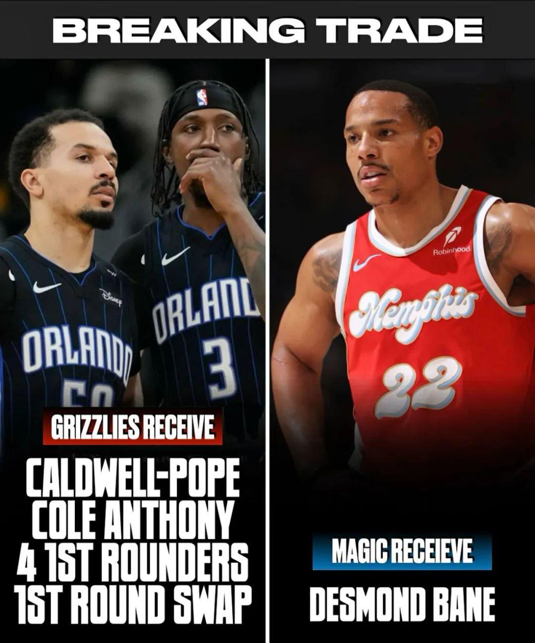 具体的交易细节想必大家都知道,魔术送出波普、科尔安东尼、四个首轮签和一个首轮互换,得到贝恩。