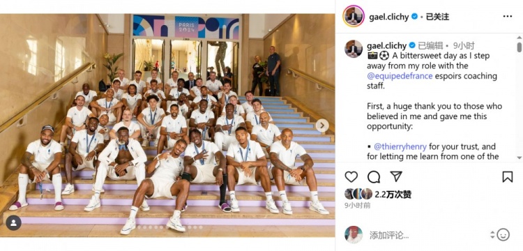 克利希在ins写道:“这是一个苦乐参半的日子,因为我将离开法国U21教练组的职位。